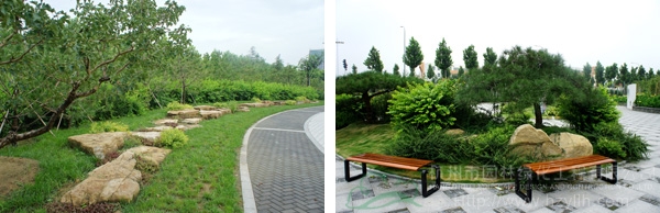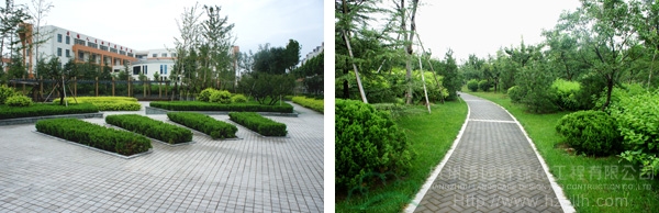 每個景觀節(jié)點上,植物的配置方法都是不一樣的,如在下沉廣場,主要是以小龍柏、金葉女貞等小灌木片植成方形或弧形,間或點綴石楠、梅樹,看起來規(guī)整、簡潔;而在設(shè)計風(fēng)格為江南園林的南廣場上,是將貴重的造型油松單植,通過不同的組合,形成三個風(fēng)格相近的綠島,周邊種植美人蕉、玉簪、竹子,并砌起白墻,上面開圓形拱門或圓窗,散發(fā)出詩意江南的靜謐和婉約氣息?!坝雾降朗秦灤┱麄€景觀的軸線,為了形成曲徑通幽的景觀效果,我們將對植、孤植、叢植都多種方法結(jié)合運用,特別是在三叉路口,多種植海棠、櫻花、杏花等,一方面,花開的時候,綠葉間繁花點點,會吸引人們不斷向前探尋更多的美景;而花落之后,茂密的枝葉又形成隱隱約約的視覺感受,前方轉(zhuǎn)過彎后風(fēng)景什么樣,又讓人很想去看看?!备呓?jīng)理笑著說。