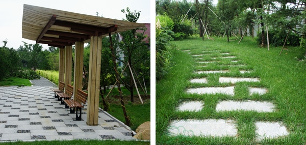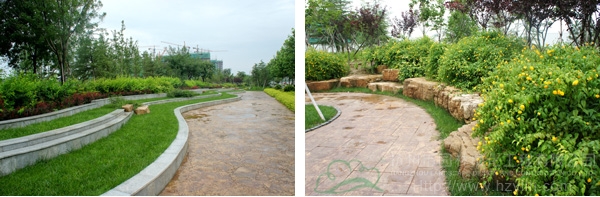 而在道路十字路口的節(jié)點處,則主要是用10cm×10cm的小花崗巖鋪地,鋪出來的路面整潔、平坦,看似簡單,實則對施工技術(shù)要求相當(dāng)高。草坪中的地面鋪裝,則采用花崗巖汀步,用錯縫鋪裝法,兩塊花崗巖之間用草皮鑲嵌,就像給每塊花崗巖鑲了一道綠邊,與旁邊的草坪和諧地融為一體。貫穿整個工程的游憩步道,全部采用“人字形”的鋪裝方法,中間用透水磚、兩邊以花崗巖鑲邊,透水磚價格不高,用以鑲邊的花崗巖是利用了鋪裝中剩余的邊料,雖然用料簡單,但通過對技術(shù)的嚴(yán)格要求,鋪出的路面卻整潔而不失韻味,是一種實用、環(huán)保、節(jié)約的做法。