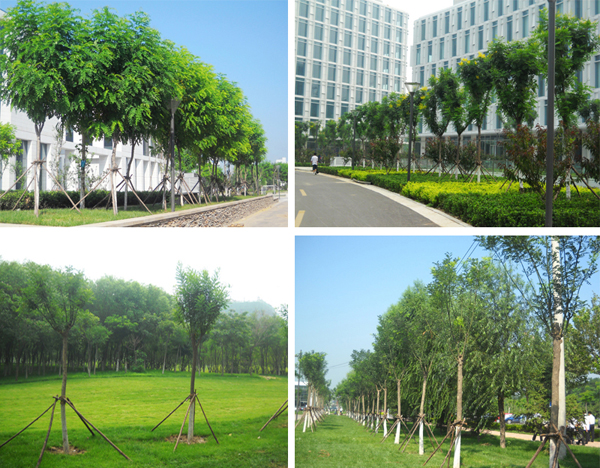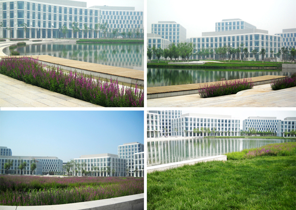 本工程是大型商務(wù)園配套景觀綠化工程,整個(gè)項(xiàng)目以人工湖為中心將建筑呈環(huán)形布置,分為內(nèi)環(huán)、中環(huán)、外環(huán)。綠化圍繞建筑均勻有層次的分布,環(huán)路兩側(cè)栽植國槐;辦公樓之間則種植日本晚櫻、碧桃、海棠等觀花、觀葉類喬木,以及黃楊、女貞等灌木和綠籬;中心湖區(qū)域兩側(cè)的能源半島和濕地半島上被喜水性植物覆蓋,起到凈化湖水的作用,岸邊種植垂柳,開辟休閑區(qū)域;園路鋪裝材料選用水洗石、花崗巖,石汀、鋪裝與綠地自然銜接;再加上花壇和景觀小品,各種觀賞性植物互相襯托,喬木與灌木合理搭配,使得景觀與建筑、環(huán)境完美結(jié)合。
