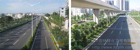 國(guó)道205深圳段改建工程景觀綠化工程G5402標(biāo)段,是深圳市龍崗區(qū)迎大運(yùn)重點(diǎn)景觀工程,位于國(guó)道205深圳段龍崗區(qū)地鐵三號(hào)線愛(ài)聯(lián)地鐵站至坪地與惠州市交界處,總綠化面積210000㎡?!耙匀藶楸荆鹬刈匀弧?、“ 處處有綠葉、無(wú)處不飛花”等設(shè)計(jì)理念貫穿于工程始終,整條中央綠化帶位于高架橋下,長(zhǎng)勢(shì)茂盛的各類(lèi)植物形成一條色彩繽紛的彩帶擁簇著高架橋段,使整條橋段與綠化景觀有機(jī)融合。整條道路的景觀,不僅體顯出一個(gè)濱海大都市獨(dú)有的景觀特色,更彰顯出這個(gè)城市的生機(jī)活力與熱情奔放。