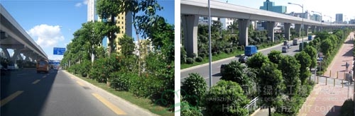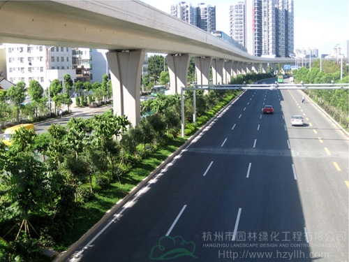 該工程最大的特色和亮點為:“以人為本,尊重自然”、“ 處處有綠葉,無處不飛花”等自然生態(tài)的設計理念貫穿始終;中央綠化帶位于高架橋下,長勢茂盛的各類植物形成一條繽紛絢麗的彩帶擁簇著高架橋段,使整條橋段與綠化景觀有機融合。2012年,該工程榮獲中國風景園林學會“優(yōu)秀園林綠化工程金獎”。