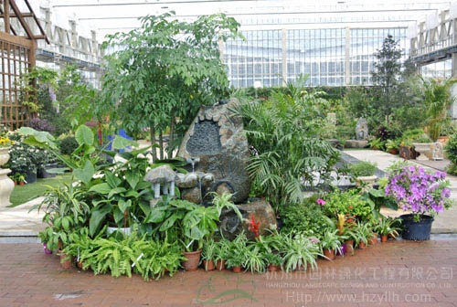 走進玻璃溫室的大門,一處小巧別致的水景,掩映在一片綠色中,古樸而有趣的石頭,細細的流水,勾勒出一幅恬靜的畫面。兩邊是花園中心的英文縮寫GARDEN CENTER,每一個英文字母都是一個小噴泉,流水不斷,與怒放的杜鵑花一起,奏響春天的歡快旋律,拉開青山湖?花園中心中庭景觀的序幕。