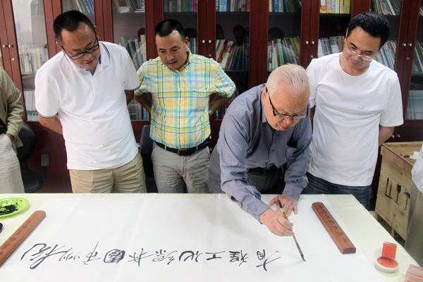 孫老不僅是一位園林規(guī)劃設(shè)計(jì)專(zhuān)家,同時(shí)也是一位書(shū)畫(huà)名家,他曾師從徐悲鴻、孫多慈教授學(xué)畫(huà),具有很高的藝術(shù)修養(yǎng)。在我們的邀請(qǐng)下,孫老欣然提筆,寫(xiě)下了“杭州市園林綠化工程有限公司”、“易大景觀”等公司名稱(chēng),以及“天然圖畫(huà)”、“造化為師”等題詞,以精準(zhǔn)的語(yǔ)言凝煉了他對(duì)園林行業(yè)的看法,寥寥數(shù)語(yǔ)中,讓我們深受啟發(fā)。行云流水的筆法、流暢飽滿(mǎn)的線(xiàn)條,每一幅題字都一氣呵成,每一幅題字都是一幅藝術(shù)畫(huà)。每幅題字寫(xiě)完,大家都會(huì)報(bào)以熱烈的掌聲,孫老對(duì)園林的深刻見(jiàn)解及深厚的書(shū)法功底令我們深深折服。