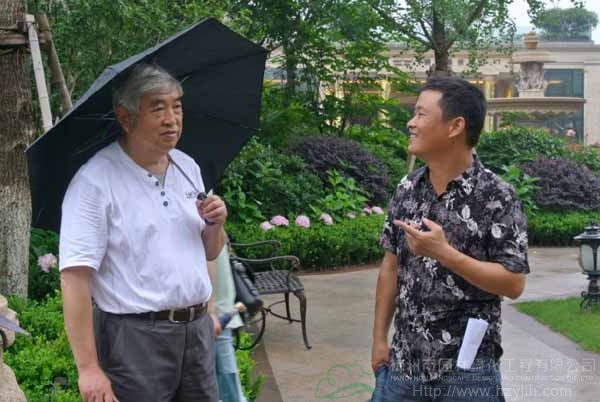 中國風景園林學會園林工程分會秘書長商自福(左)在現(xiàn)場進行考察